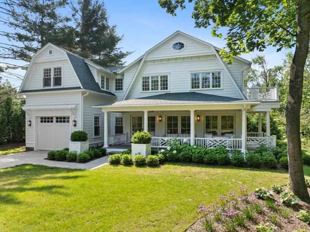 Nestled in a private setting within the Wequetonsing Landowners Association, this home blends timeless cottage character with thoughtful modern updates. Designed by Gorman Design and offered beautifully furnished, it features new wood flooring, a custom Calcutta gold marble kitchen, and a main-floor primary suite with its own fireplace and an elegant bath with heated marble floors. An addition expanded the home to include a large, light-filled family room above the garage, a true showpiece with a fireplace set against a custom slab backdrop that creates a striking focal point. This inviting space also connects to a full bath with sauna. The attached one-car garage is fully finished. The main level also offers a kitchen that opens to the dining area and a living room centered on a striking fireplace, complemented by a custom-designed powder room with Calcutta sink and cabinetry. A wraparound porch extends the living space outdoors, perfect for both entertaining and relaxation. Upstairs, three well-proportioned bedrooms—one with a private balcony—are served by two full baths. The second floor also features a laundry room with extensive cabinetry and marble countertops, combining function and style. Throughout the home, custom cabinetry is a unifying theme, from built-in mudroom storage to carefully designed bunkbeds and detailed millwork. The setting is equally inviting, with landscaped grounds, a stream and small pond, and a generous yard. Association membership provides access to a dock for kayaks and paddle boards. The result is a warm and welcoming retreat that feels both refined and true to the Weque cottage tradition.